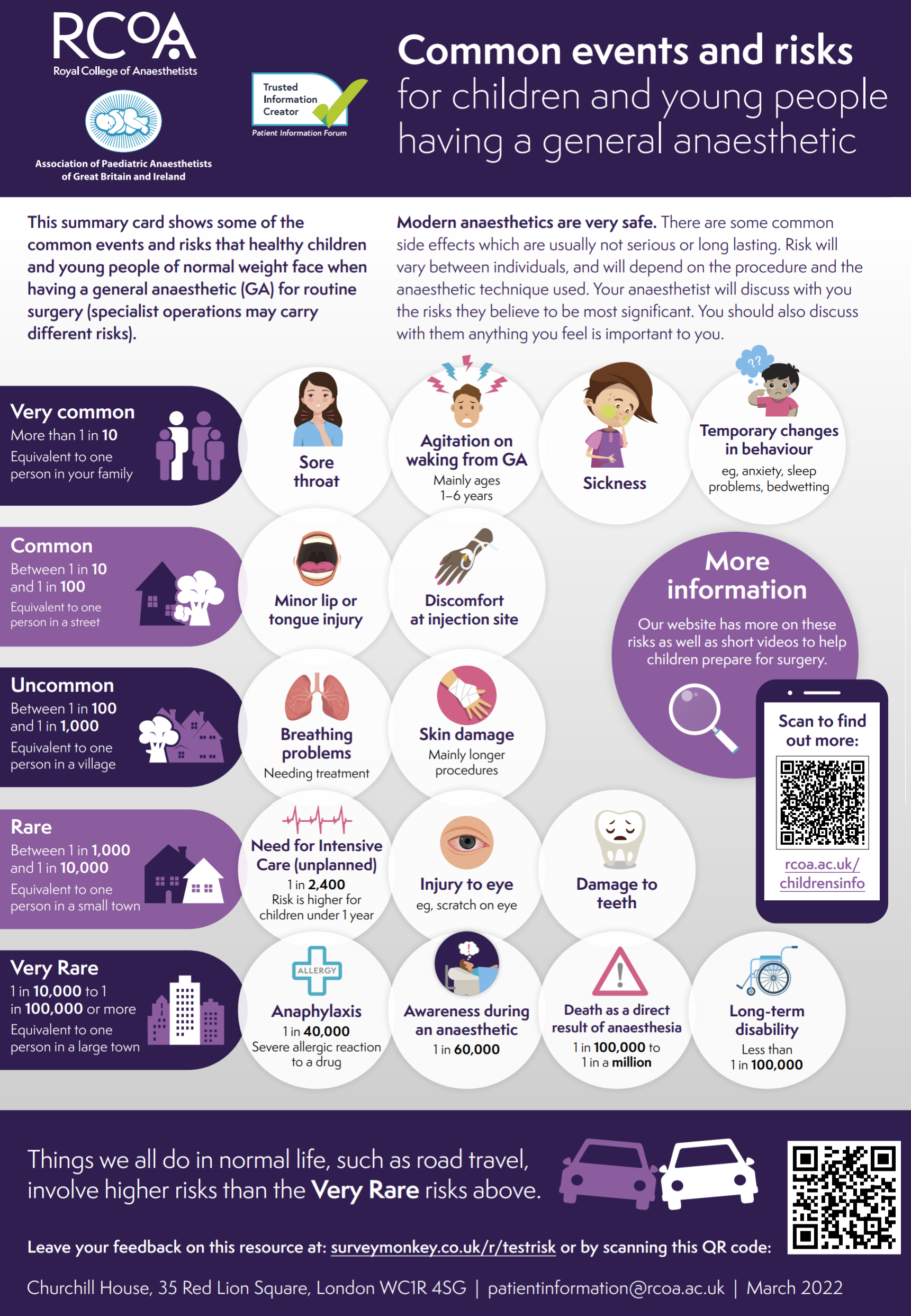 The Royal College of Anaesthetists have created this infographic which shows some of the common events and risks that healthy children and young people of normal weight face when having a general anaesthetic (GA) for routine surgery (specialist operations may carry different risks).